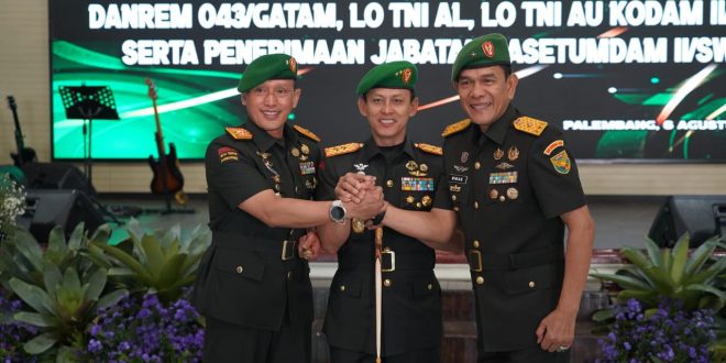 Palembang (sundalanews.com) – Pangdam II/Sriwijaya (Swj) Mayjen TNI Ujang Darwis, M.D.A., memimpin langsung upacara Serah Terima Jabatan (Sertijab) Komandan Korem (Danrem) 043/Garuda Hitam (Gatam) dari Brigjen TNI Rikas Hidayatullah, S.E., M.M., kepada pejabat baru Brigjen TNI Haryantana, S.H. Upacara digelar khidmat di Gedung Sudirman, Makodam II/Swj, Palembang, Sumatera Selatan.