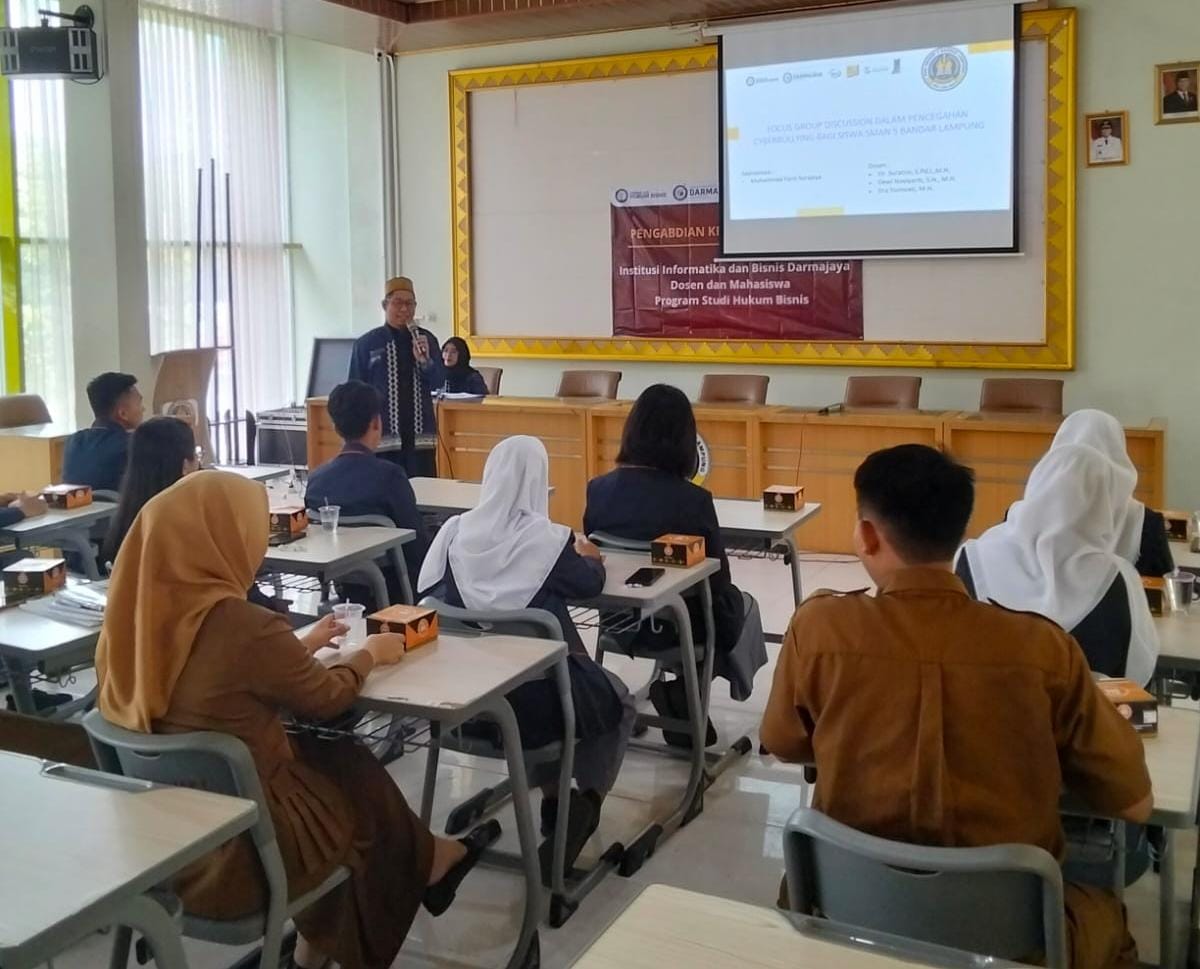 Kegiatan bertajuk “Focus Group Discussion dalam Pencegahan Cyberbullying bagi Siswa SMAN 5 Bandar Lampung” ini dipimpin oleh Dr. Suratno, S.Pd.I., M.H. selaku ketua tim, dengan anggota Dewi Noviyanti, S.H., M.H. dan Yuniwati, M.H. Ketiganya merupakan dosen Program Studi Hukum Bisnis.