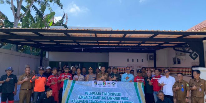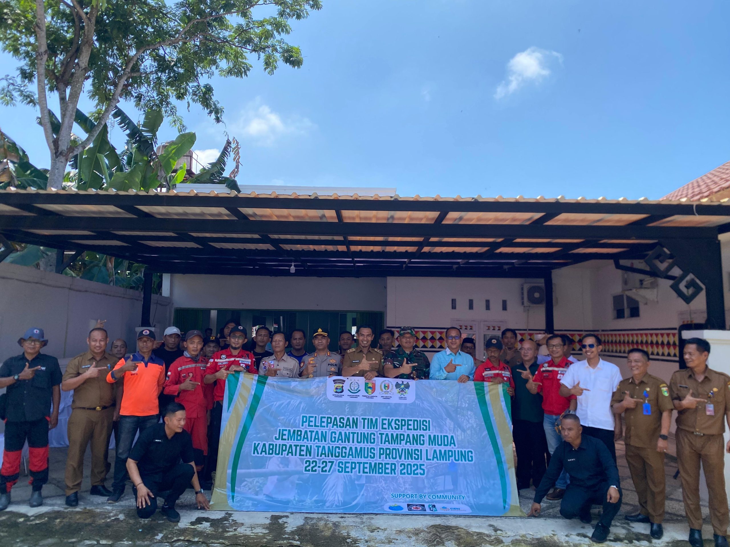 TANGGAMUS (sundalanews.com) – Pemerintah Kabupaten Tanggamus secara resmi melepas Ekspedisi Jembatan Gantung Tampang Muda, Senin (22/9/2025). Aksi kolaborasi ini bertujuan memperbaiki Jembatan Gantung Tampang Muda di Kecamatan Pematang Sawa yang rusak dan membahayakan warga, terutama pelajar. Perbaikan ditargetkan rampung akhir September 2025 agar akses anak sekolah kembali aman.