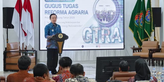 Bandar Lampung (sundalanews.com) – Gubernur Lampung, Rahmat Mirzani Djausal diwakili oleh Sekretaris Daerah Provinsi Lampung, Marindo Kurniawan, membuka secara resmi Rapat Koordinasi Akhir, Penyelenggaraan Gugus Tugas Reforma Agraria (GTRA) Tahun 2025, dengan tema “Reforma Agraria yang Berkelanjutan dan Berdampak melalui Sinergi Multistakeholder,” di Aula Kantor BPN Provinsi Lampung, Kamis (18/9/2025).