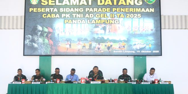 Lampung (sundalanews.com) – Kasdam XXI/Radin Inten, Brigjen TNI Andrian Susanto, S.I.P., M.Han., M.I.Pol., memimpin langsung Sidang Parade Penerimaan Calon Bintara (Caba) Prajurit Karier (PK) TNI AD Gelombang II TA 2025 Panda Lampung, yang digelar di Aula Sudirman Makodam XXI/Radin Inten, Jl. Teuku Umar, Penengahan, Bandar Lampung, Rabu (15/10/2025).