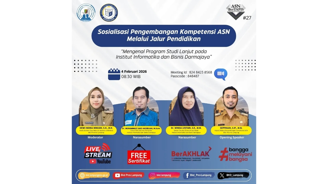 Kegiatan ydigelar secara daring hari ini (4 Februari 2026) mengangkat tema studi lanjut di IIB Darmajaya sebagai salah satu jalur strategis pengembangan kompetensi ASN.