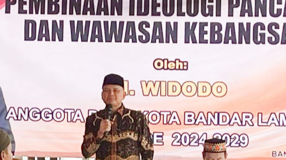 Bandar Lampung (sundalanews.com) – Anggota Komisi II DPRD Kota Bandarlampung Hi. Widodo melakukan sosialisasi ideologi Pancasila dan wawasan kebangsaan (PIP-WK) di seputaran Gunung Sulah, Kota Bandarlampung, Sabtu (07/03/2026).