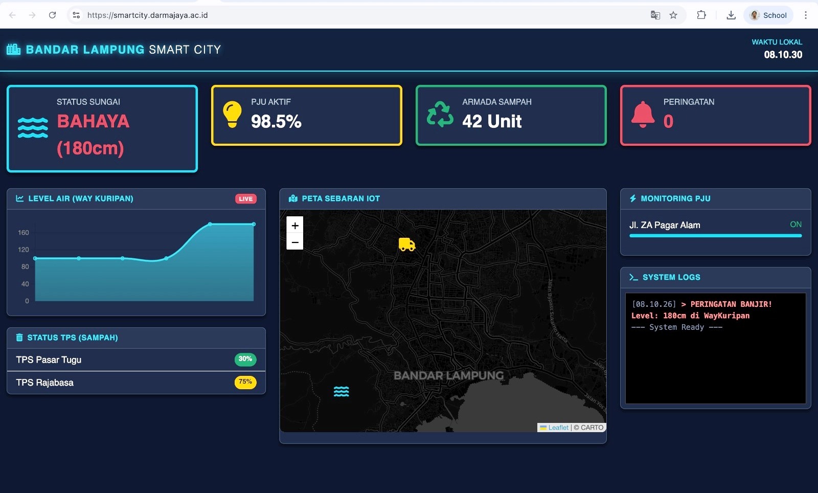 Layanan tersebut terintegrasi dalam dashboard Smart City Monitoring yang mampu menampilkan berbagai indikator penting, mulai dari status tinggi muka air sungai, kondisi lampu penerangan jalan umum (PJU), armada pengangkut sampah, hingga peringatan dini banjir. Pada kondisi tertentu, sistem akan secara otomatis mendeteksi kenaikan level air dan mengirimkan peringatan bahaya kepada operator.