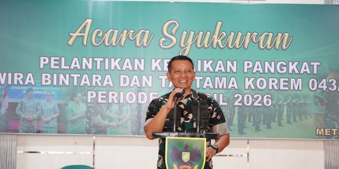 “Pada periode ini, sebanyak 220 personel jajaran Korem 043/Gatam memperoleh kenaikan pangkat dan 25 orang di antaranya melaksanakan syukuran di Makorem 043/Gatam yang sama sam kita cintai. Atas nama pribadi dan satuan, saya mengucapkan selamat kepada seluruh prajurit yang naik pangkat, jadikan momentum ini sebagai pemicu semangat untuk terus berkembang, berpikir maju dan memberikan kontribusi terbaik bagi satuan, “tegas Danrem.