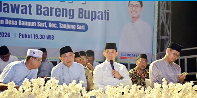 Tanjung Sari (sundalanews.com)  – Bupati Lampung Selatan, Radityo Egi Pratama, bersama Wakil Bupati M. Syaiful Anwar menghadiri kegiatan Sholawat Bareng Bupati (Shobat) yang digelar di Lapangan Desa Bangun Sari, Kecamatan Tanjung Sari, Selasa malam (21/4/2026).
