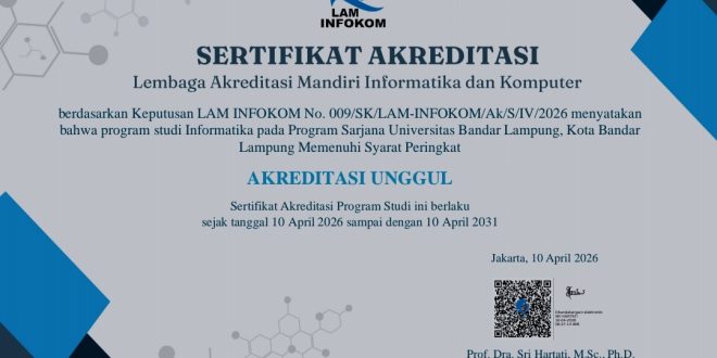 Bandar Lampung (sundalanews.com) — Universitas Bandar Lampung (UBL) kembali mencatatkan capaian strategis dalam penguatan mutu pendidikan tinggi. Program Studi Informatika pada jenjang Sarjana (S1) resmi meraih peringkat Akreditasi Unggul, berdasarkan Keputusan Lembaga Akreditasi Mandiri Informatika dan Komputer (LAM INFOKOM) Nomor 009/SK/LAM-INFOKOM/Ak/S/IV/2026.