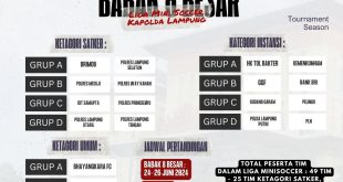 Bandar Lampung (sundalanews.com) – Kompetisi Mini Soccer Kapolda Lampung Cup dalam rangka memeriahkan Hari Bhayangkara ke-78 Tahun 2024 telah memasuki babak delapan besar. Babak 8 besar Mini Soccer Kapolda Lampung Cup dibagi dalam tiga kategori, Satuan Kerja (Satker), instansi, dan umum. Delapan tim terbaik kategori satker meliputi Brimob dan Polres …