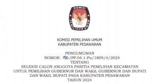Pesawaran (sundalanews.com) – PENGUMUMAN SELEKSI CALON ANGGOTA PANITIA PEMILIHAN KECAMATAN UNTUK PEMILIHAN GUBERNUR DAN WAKIL GUBERNUR DAN BUPATI DAN WAKIL BUPATI PADA KABUPATEN PESAWARANTAHUN 2024 NOMOR: 150 /PP.04.1-Pu/ 1809/4/2024 Dalam rangka pembentukan Calon Anggota Panitia Pemilihan Kecamatan untuk Pemilihan Gubernur dan Wakil Gubernur dan Bupati dan Wakil Bupati pada Kabupaten …