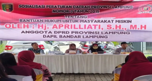 BANDAR LAMPUNG (SUNDALANEWS.COM) – Anggota DPRD Provinsi Lampung, Aprilliati menggelar sosialisasi peraturan daerah Nomor 3 Tahun 2015 tentang Bantuan Hukum untuk Masyarakat Miskin. Aprilliati menyampaikan kegiatan ini menjadi salah satu upaya untuk menyampaikan kepada masyarakat tentang perda yang memberikan bantuan hukum. “Sosialisasi ini sebagai jembatan untuk kita menyampaikan kepada masyarakat …