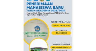Way Kanan (Sundalanews.com) – Universitas Lampung (UNILA) Program Studi Diluar Kampus Utama (PSDKU) Way Kanan membuka Penerimaan Mahasiswa Baru Program Akademik Tahun 2023/2024. Program Diploma Tiga (D3) Akuntansi untuk periode pendaftaran Tanggal 24 Juli sampai dengan 28 Juli 2023, dan pelaksanaan tes tertulis pada tanggal 29 Juli 2023, Selasa (25/07/2023). …