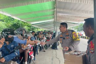 Polisi Sambangi Pemudik Roda Dua, Bagikan Susu dan Eskrim untuk Anak.