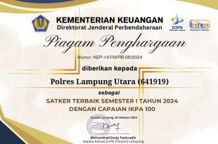 Read More »Jadi Satker Terbaik Semester I 2024, Polres Lampung Utara Terima Penghargaan Kementerian Keuangan